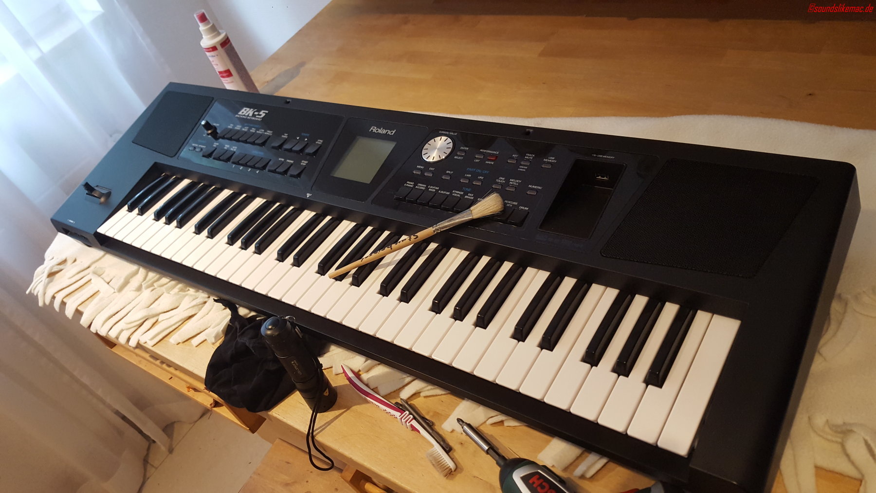 Nach einer kurzen Tour durch die Pfalz, einer Grundreinigung und dem geclonten Stick vom BK-9 kann ich jetzt wieder ruhig weiterschlafen, wenn ich mal von Keyboardfressenden Dinosauriern, auf die Bühne fallenden Tänzern oder dem versehentlich übers Keyboard gekippten Glas Ramazotti (was der Tod meines DX-7 war) träume…