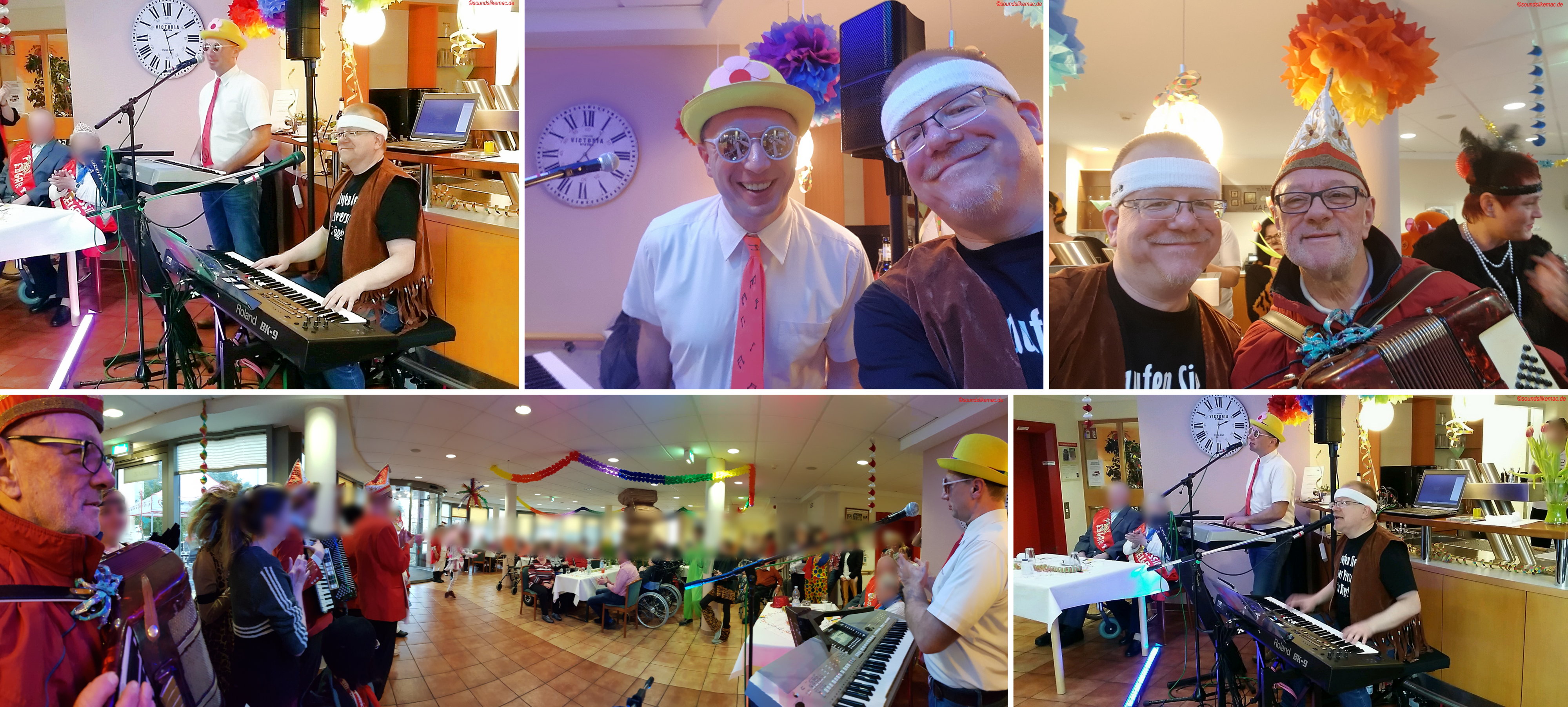 Es kam nämlich so, dass plötzlich eine Oberabordnung der „Grad ze laed’s“ in der Tür stand um mit ihrem Akkordeonspieler ebenfalls ein wenig Faasend in die Seniorenresidenz zu tragen. Dieser entpuppte sich unverhofft als mein alter NOUS-Mitstreiter Karl, der über meine Anwesenheit gleichermaßen überrascht war. So kam es zu einem kurzen Gastspiel und der Veranstalter hatte am Ende statt des Alleinunterhalters gleich 3 Musiker am Start, denn der gute Patrick von Tinitus wollte mich an diesem Tag auch nicht alleine auf die Menschheit loslassen…