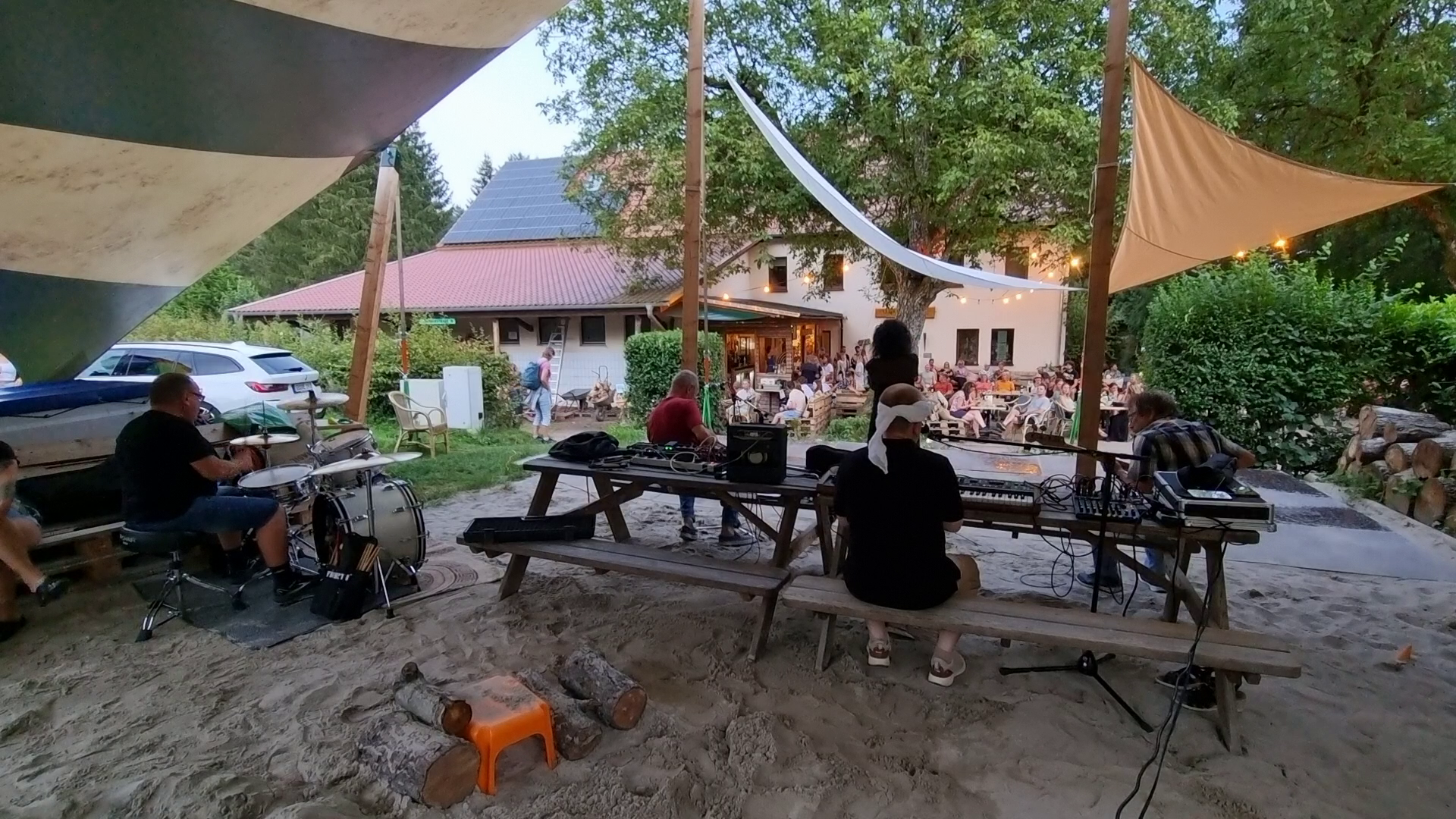Nach etwa 1h zog sich der Himmel zu und dann kam auch der (heftige) Regen. Ein Teil der Campinggäste verzog sich in Zelte und Wohnwagen. Aber dann kamen etwa 50 musikbegeisterte Gäste einfach zu uns in den Sandkasten und wir spielten quasi mitten in unserem Publikum. Das war eine besondere Spielatmosphäre, die wohl weder das Publikum, noch das Girtenmühlen-Team oder gar wir Musiker so schnell vergessen werden.
