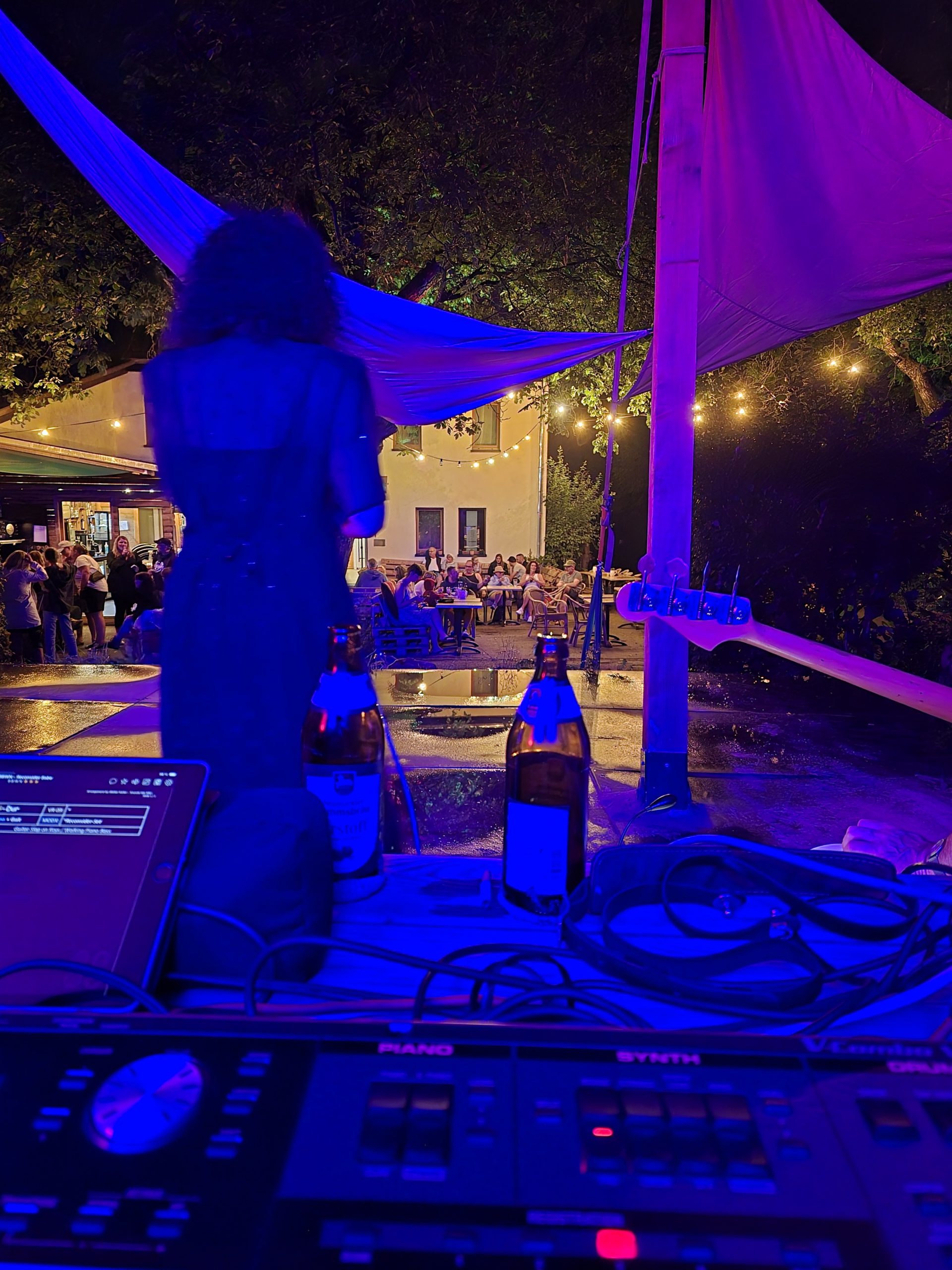 Punkt 2200 beendete ein dann doch recht deutlicher Blitz mit unmittelbar folgendem äußerst kräftigen Donner (begleitet von spürbaren Spannungsschwankungen bei unseren Geräten) zur Sicherheit der Gäste (und unserer kleinen Anlage) unser Spiel. Ging alles gut – Petrus muss ein Blueser sein…